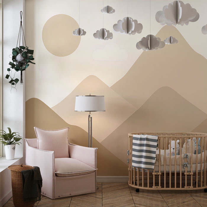 Μεταμορφώστε το δωμάτιο του παιδιού σας με αυτό το καταπραϋντικό ταπετσαρία που απεικονίζει έναν μινιμαλιστικό ορεινό τοπίο. Οι διάφορες αποχρώσεις του μπεζ και του καφέ δημιουργούν μια ζεστή και ήρεμη ατμόσφαιρα, ιδανική για να προάγει τον ύπνο και την ονειροπολία. Ένας απαλός ήλιος και μερικά σύννεφα προσθέτουν μια χαρούμενη πινελιά στο σύνολο.