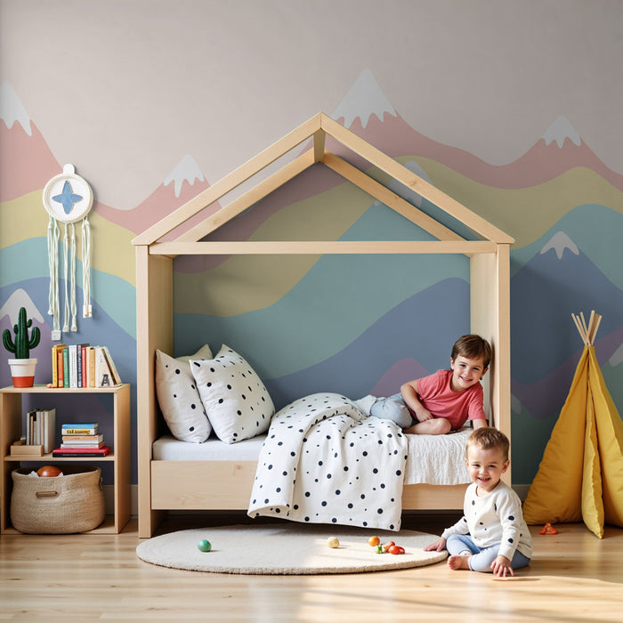 Οι χιονισμένες κορυφές προσθέτουν μια πινελιά μαγείας, ενώ οι κύματα χρωμάτων φέρνουν στο μυαλό ονειρικά τοπία, μεταφέροντας το παιδί σας σε έναν κόσμο γαλήνης και περιπέτειας. Αυτή η τοιχογραφία είναι ιδανική για να ενθαρρύνει τη φαντασία, μετατρέποντας τον χώρο σε έναν καταφύγιο ειρήνης.