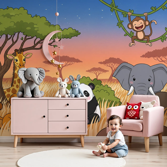 Χαρτί τοίχου παιδικού δωματίου | Διασκεδαστικό σαφάρι με αξιαγάπητα ζωάκια