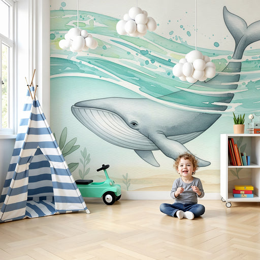 KidsWallΚαταδυθείτε στον υδάτινο κόσμο με αυτό το χαρτί τοίχου για παιδιά που απεικονίζει ένα υπέροχο φάλαινα που γλιστρά μέσα από απαλά κύματα. Αυτή η υδά...