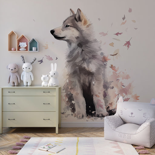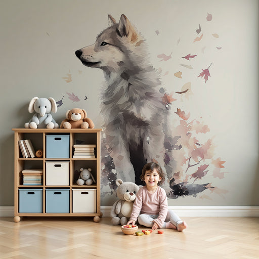 Εμφάνιση όλων των λεπτομερειώνKinderzimmer Tapete | Kleiner Wolf unter Herbstblättern