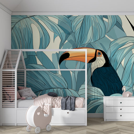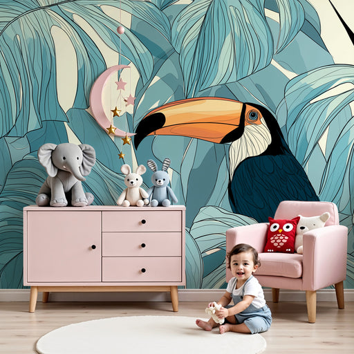 Εμφάνιση όλων των λεπτομερειώνΧαρτί τοίχου παιδικού δωματίου | Πολύχρωμο τουκάν και τροπικό φύλλωμα