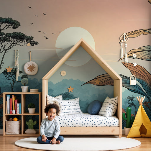 KidsWallΚαταδυθείτε σε ένα συναρπαστικό σύμπαν με αυτό το ταπετσαρία για παιδιά που απεικονίζει ένα ήρεμο ζούγκλας. Ο δύσης του ήλιου αποκαλύπτει απαλές απ...