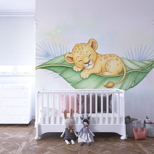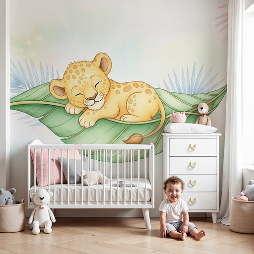 Εμφάνιση όλων των λεπτομερειώνΧαρτί τοίχου παιδικό δωμάτιο | Μικρός λεοπάρδαλη κοιμάται πάνω σε φύλλο