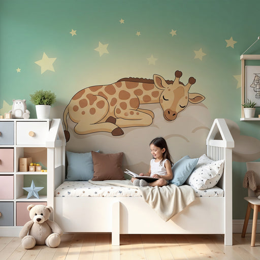 KidsWallΜετατρέψτε το δωμάτιο του παιδιού σας σε έναν καταφύγιο ειρήνης με αυτό το ταπετσαρία για παιδιά που αναδεικνύει μια μαγευτική καμηλοπάρδαλη στη μέ...