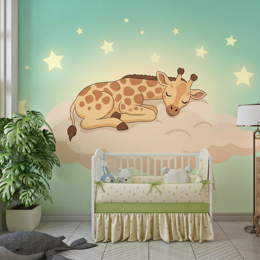 Papel de parede criança | Girafa ternamente adormecida em uma nuvem