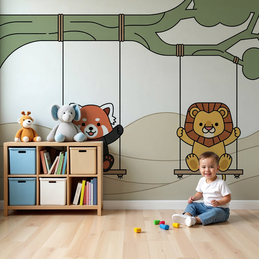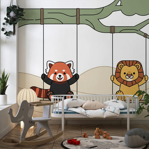Χαρτί τοίχου παιδικό δωμάτιο | Κόκκινο πάντα και λιοντάρι σε κούνια