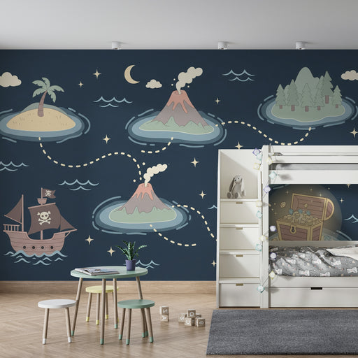 KidsWallΕτοιμαστείτε για μια επική περιπέτεια με αυτό το χαρτί τοίχου για παιδιά που απεικονίζει ένα ζωντανό χάρτη θησαυρού. Ένα γοητευτικό πειρατικό πλοίο...