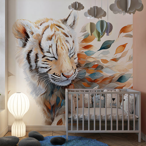 KidsWallΜεταμορφώστε το δωμάτιο του παιδιού σας με αυτό το ταπετσαρία για παιδιά που απεικονίζει ένα τίγρη με γαλήνιο βλέμμα και φύλλα που αιωρούνται σε ζε...