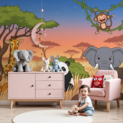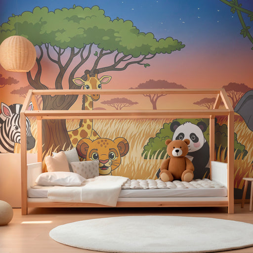 KidsWallΒυθίστε το παιδί σας στον συναρπαστικό κόσμο της Σαβάνα με αυτό το χαριτωμένο παιδικό ταπετσαρία που απεικονίζει ένα σαφάρι κατά τη διάρκεια του ηλ...