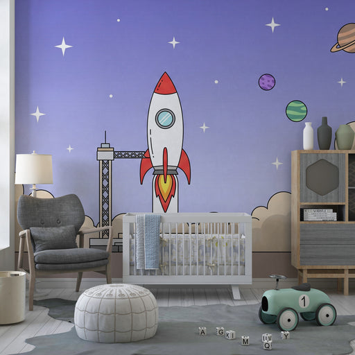 KidsWallΕτοιμαστείτε για μια συναρπαστική διαστημική περιπέτεια με αυτό το ταπετσαρία για παιδιά που απεικονίζει ένα πύραυλο που απογειώνεται σε έναν ουραν...