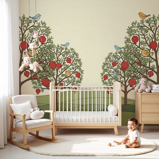 KidsWallΠροσθέστε μια πινελιά φύσης και ελαφρότητας στο δωμάτιο του παιδιού σας με αυτό το χαρτί τοίχου για παιδιά, που απεικονίζει δέντρα με κόκκινα φρούτ...