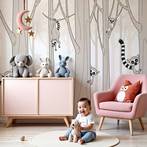 Χαρτί τοίχου παιδικού δωματίου | Παιχνιδιάρικοι λεμούριοι στο δάσος