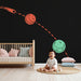 Τα έντονα κόκκινα και πράσινα χρώματα των πλανητών αντιδρούν όμορφα με το σκούρο φόντο, δημιουργώντας ένα γοητευτικό διακόσμημα που ενθαρρύνει τη φαντασία των μικρών εξερευνητών. Κάθε λεπτομέρεια, από τις χαρούμενες εκφράσεις των πλανητών έως τις στιλιζαρισμένες τροχιές, σχεδιάστηκε για να ξυπνήσει την περιέργεια και το θαυμασμό.