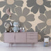 Redesign your baby's room into an adorable space with this nursery room wallpaper adorned with large stylized flowers. The soft shades of gray and beige create a serene atmosphere, ideal for promoting sleep and relaxation. Each flower, with its rounded contours and delicate center, brings a touch of softness and warmth to the space.