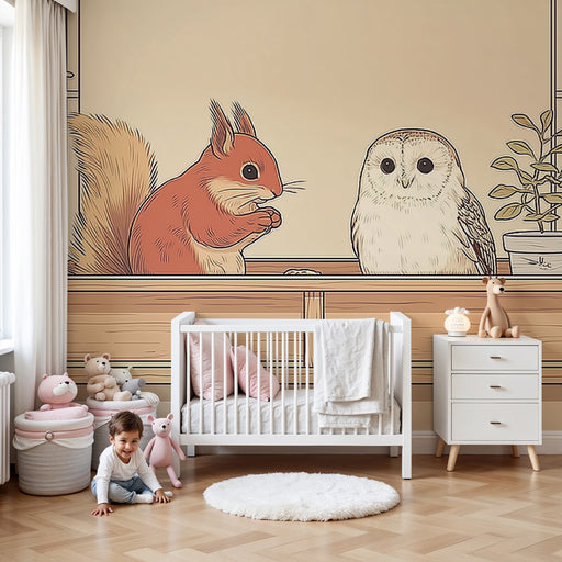 KidsWallTransform your child's room into a fun and wonderful universe with this kids room wallpaper featuring a mischievous squirrel and a curious owl, bot...