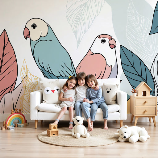 KidsWallTransform your child's room with this kids room wallpaper featuring charming birds surrounded by vibrant leaves. Two birds, in soft and soothing co...