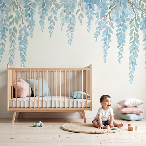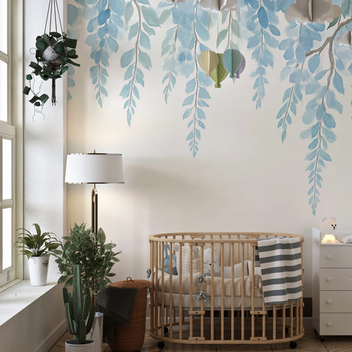 KidsWallRedecorate your child's room with this kids room wallpaper featuring delicate hanging leaves. The soothing shades of blue and green create a serene...