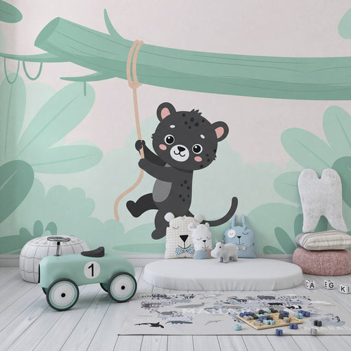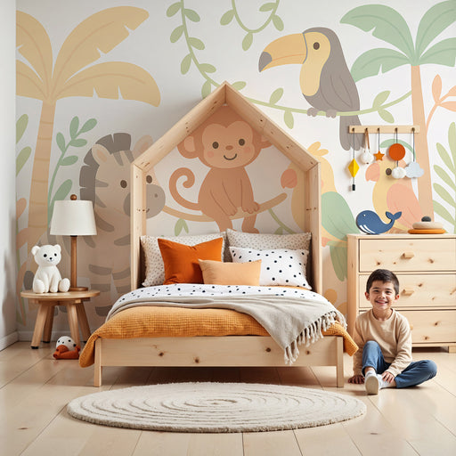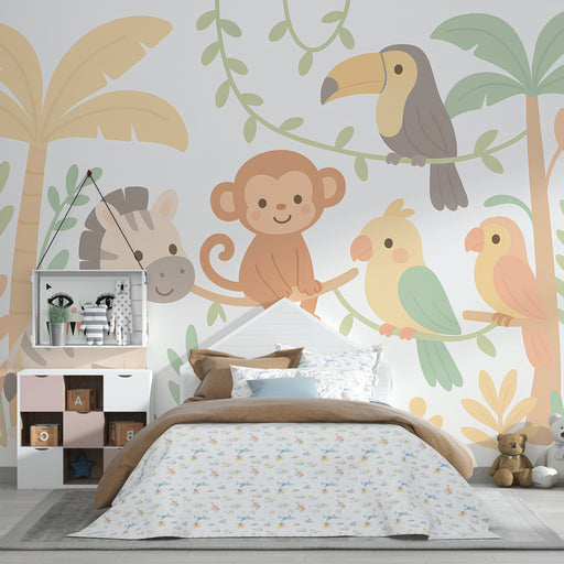 KidsWallTransform your child's room into a real tropical paradise with this kids room wallpaper depicting a joyful jungle scene. In the center, a playful m...