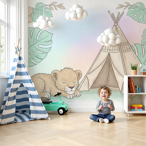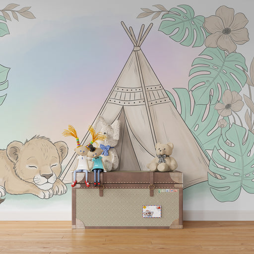 KidsWallEmbark your child in a magical universe with this kids room wallpaper. An adorable lion cub has peacefully settled next to a stylish teepee, while ...