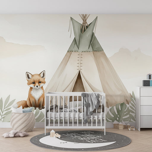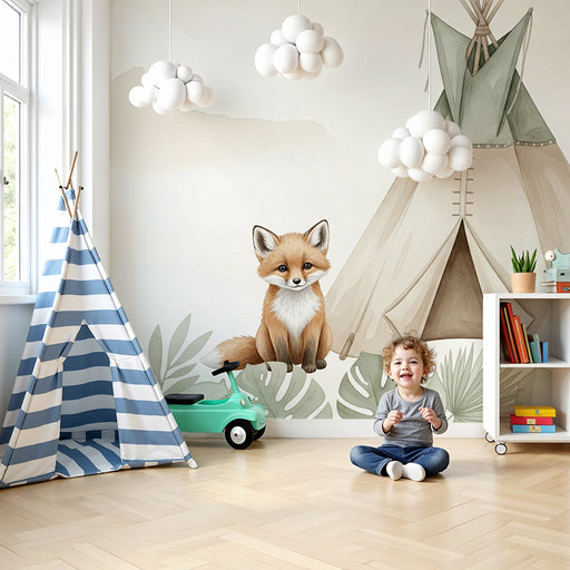 KidsWallTransform your child's room into a magical space with this kids room wallpaper featuring an adorable fox and a teepee. In a soft and soothing atmos...