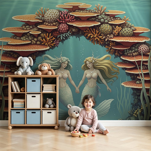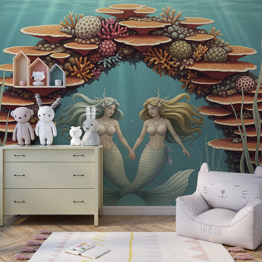 KidsWallImmerse yourself in an enchanting world with this kids room wallpaper featuring two fascinating mermaids surrounded by colorful corals. In the cent...