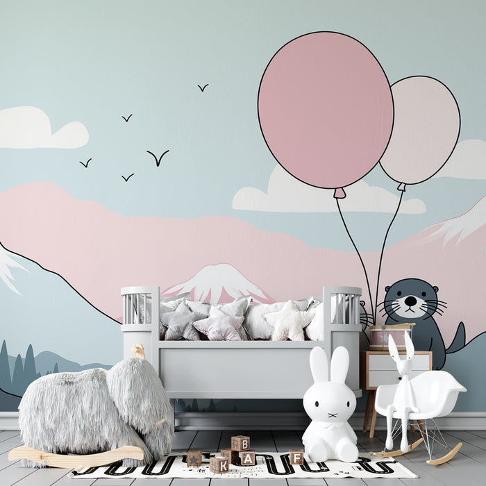 Offer a touch of sweetness and wonder to your baby's room with this nursery room wallpaper featuring two adorable otters holding colorful balloons in a soothing mountain setting. The majestic mountains, in soft shades of blue and pink, create a serene and dreamy atmosphere, ideal for a sleeping space.