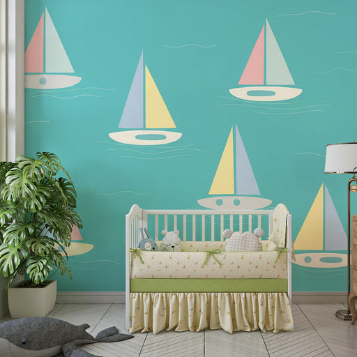 View full detailsNursery room wallpaper | Colorful sailboats on a soothing aquatic background