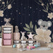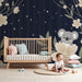 Renew your baby's room into a cute cocoon with this nursery room wallpaper featuring an adorable koala perched on a delicate flower. Against a starry dark background, the soft flowers and green leaves create a soothing and dreamy atmosphere, perfect for peaceful nights.