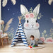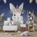 Enhance your baby's room with this nursery room wallpaper featuring an adorable rabbit adorned with a crown of pink flowers. This enchanting decor, bathed in a starry sky, invites daydreaming and tenderness.