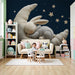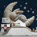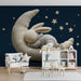 Nursery room wallpaper | Sleeping rabbit on a crescent moon with golden stars
