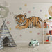 The soothing pastel tones of the stars and moons delicately contrast with the warm stripes of the tiger, offering a soft and reassuring atmosphere. Each element is carefully illustrated to ensure a joyful and playful ambiance, perfect for awakening the curiosity of little ones.