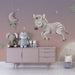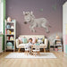 Embark on a stellar adventure with this nursery room wallpaper featuring an adorable zebra joyfully jumping through space. Set against a pastel-colored starry sky, this little companion is surrounded by soft clouds and twinkling stars, creating a magical and soothing atmosphere.