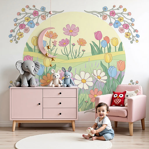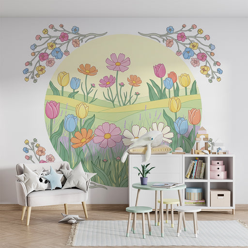 View full detailsNursery room wallpaper | Pastel floral garden with tulips and daisies