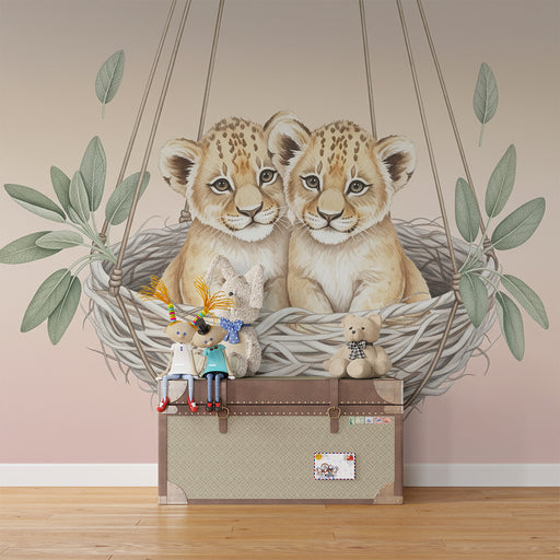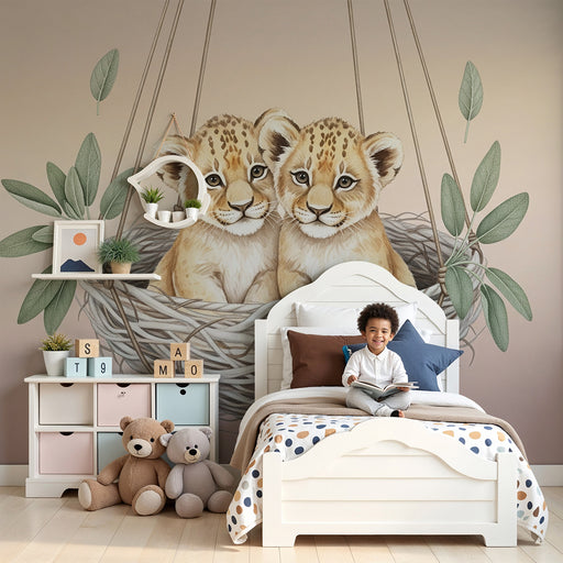View full detailsNursery room wallpaper | Twin lion cubs in a nest