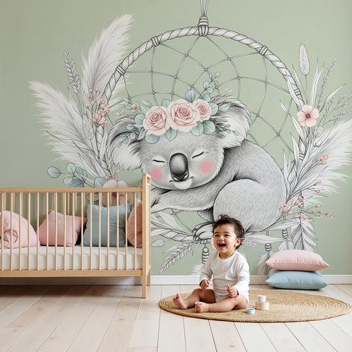 View full detailsNursery room wallpaper | Sleeping koala and floral dream catcher