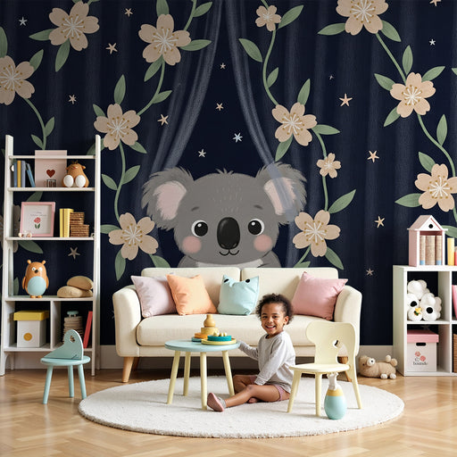 KidsWallEnhance your baby's room with this nursery room wallpaper featuring an adorable koala peeking out from behind curtains adorned with delicate flower...