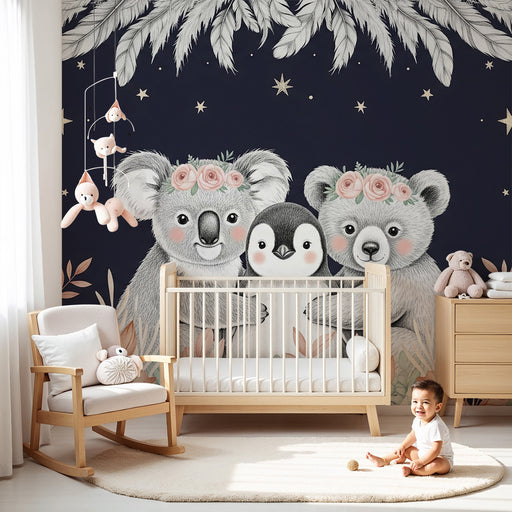 KidsWallEnhance your baby's room with this nursery room wallpaper featuring adorable koalas and a cuddly penguin. Against a starry background, these charmi...