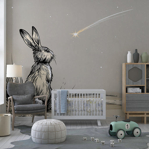 View full detailsNursery room wallpaper | Contemplative rabbit under a shooting star
