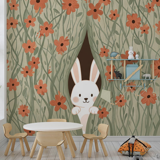 View full detailsNursery room wallpaper | Curious rabbit in the middle of flowers