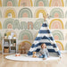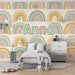 Transform your baby's room with this nursery room wallpaper featuring soft and soothing rainbow motifs. The pastel shades of pink, green, and yellow blend harmoniously to create a warm and welcoming atmosphere. Each rainbow is delicately surrounded by small butterflies, adding a touch of magic and lightness to the space.