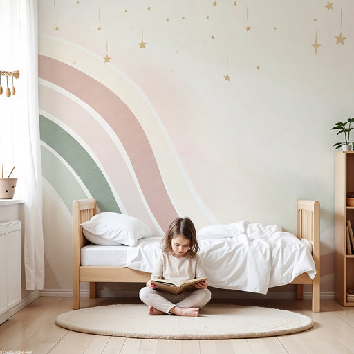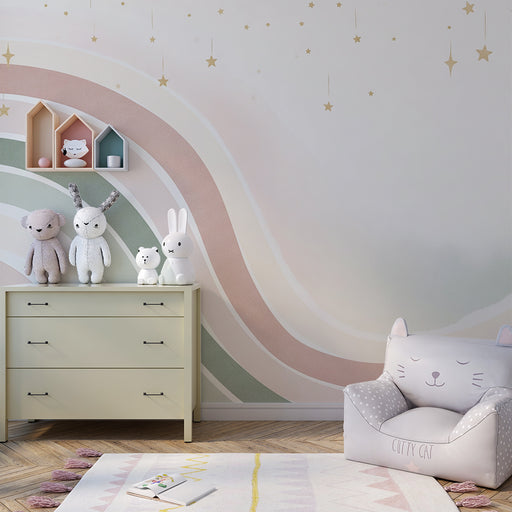 KidsWallOffer your child a magical journey with this nursery room wallpaper, where a bright rainbow crosses a starry sky, bathed in pastel hues. Each detai...