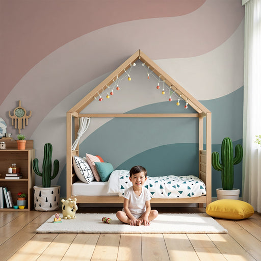 The collection celebrates chromatic diversity through designs that adapt to all atmospheres. From geometric patterns to enchanted panoramas, the colored arches come in modern or traditional versions, accompanied by fluffy clouds and twinkling stars. To balance this explosion of colors, pair it with our cloud mural wallpaper for softness. The smooth transitions between colors create a soothing effect, while satin finishes enhance the natural brilliance of the hues. Premium materials ensure the longevity of bright colors, transforming the room into an optimistic universe where creativity flourishes under the sign of cheerfulness and wonder.