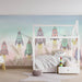 Embark on an intergalactic adventure with this kids room wallpaper depicting colorful rockets ready to launch into a pastel sky. Each rocket, adorned with delicate patterns and soft colors, emits golden sparks, creating a magical and dynamic atmosphere that will stimulate your little explorer's imagination.