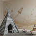 Nursery room wallpaper | Golden rocket and starry clouds in a soft sky