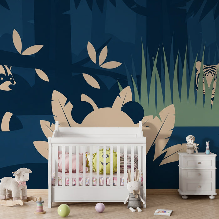 Immerse your child in a mysterious and fascinating universe with this kids room wallpaper depicting a nocturnal forest inhabited by iconic animals. At the heart of this scene, a curious panda emerges from the bushes, while a vigilant tiger camouflages in the tall grass, and a raccoon peacefully observes, adding a touch of charm to this captivating decor.