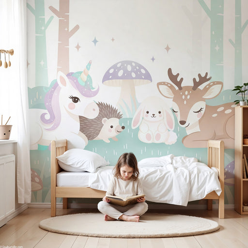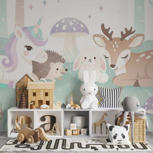KidsWallImmerse yourself in an enchanting world with this kids room wallpaper illustrating a magical forest. A colorful unicorn, a sweet rabbit, a curious ...