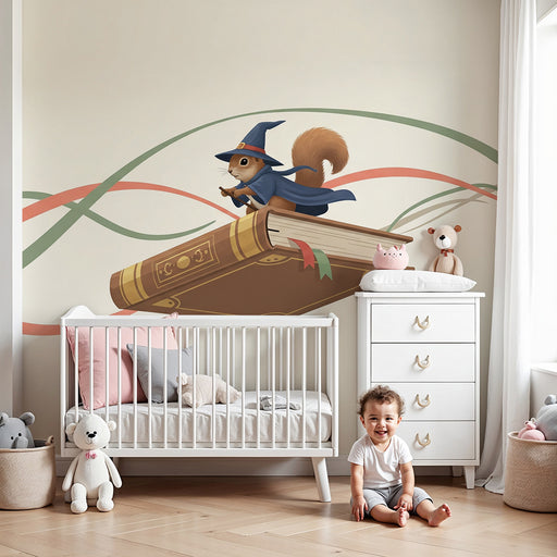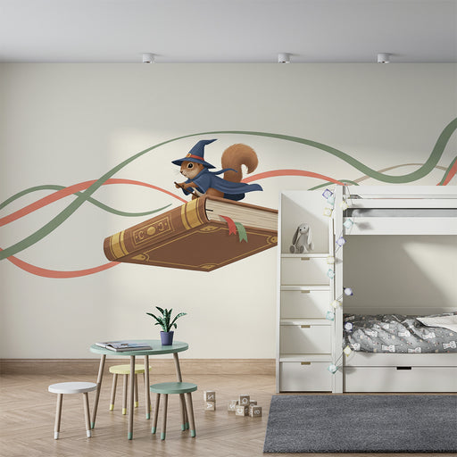KidsWallImmerse yourself in a magical world with this kids room wallpaper featuring a playful squirrel wearing a wizard's cape, perched on a flying book. T...