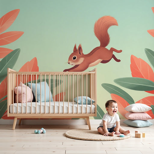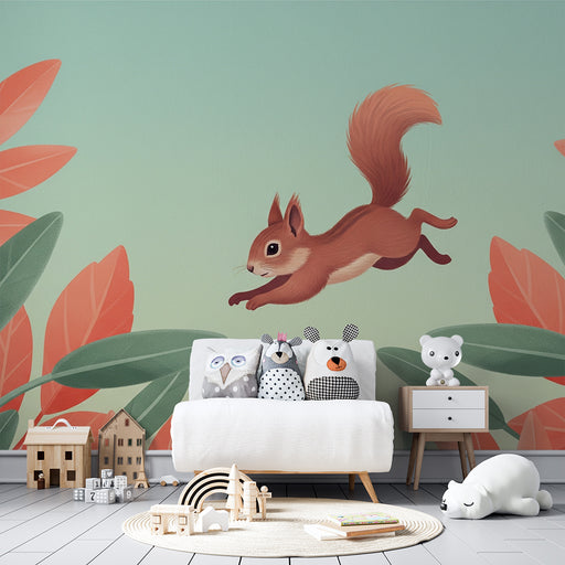 KidsWallTransform your child's room into a real adventure space with this kids wallpaper featuring a playful squirrel in mid-jump. Surrounded by vibrant le...
