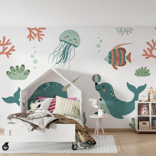 KidsWallImmerse yourself in the enchanting world of the sea with this kids room wallpaper that features adorable sea animals. A smiling whale peacefully sw...